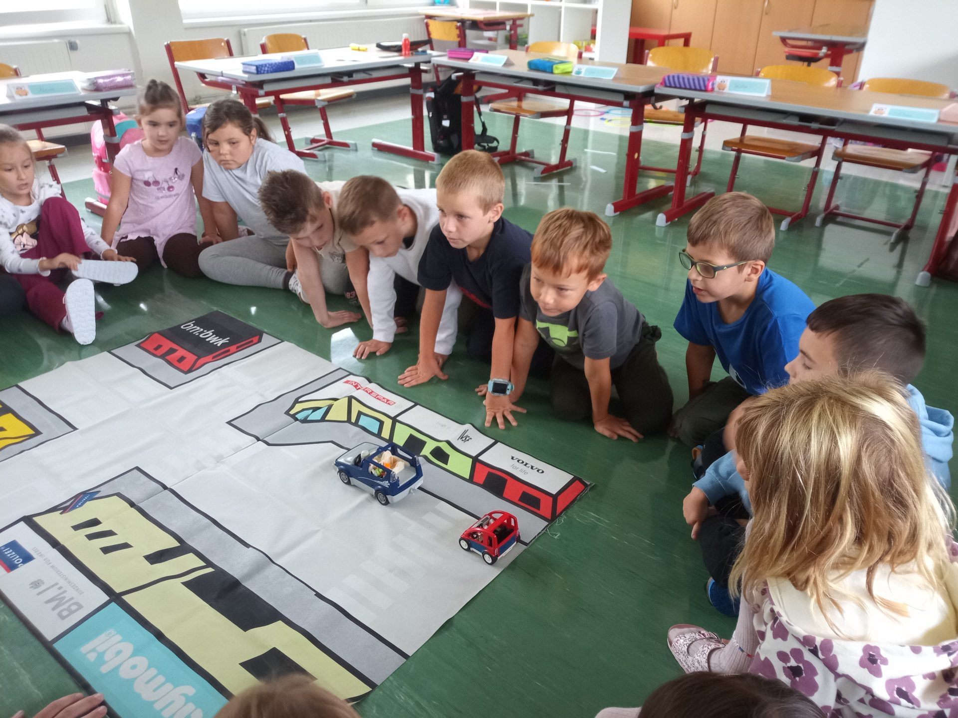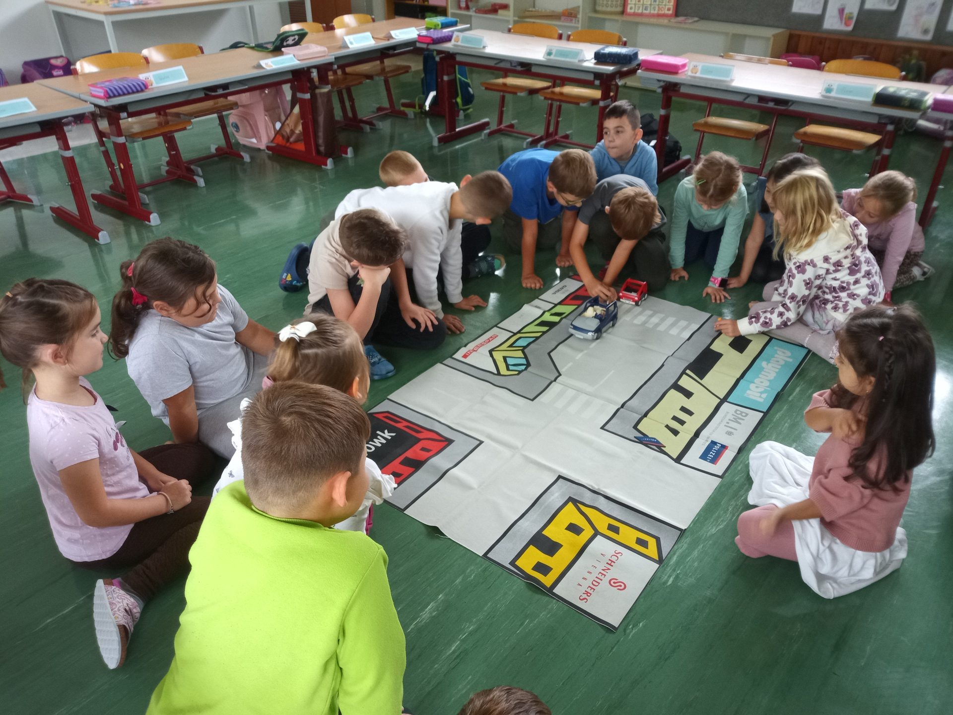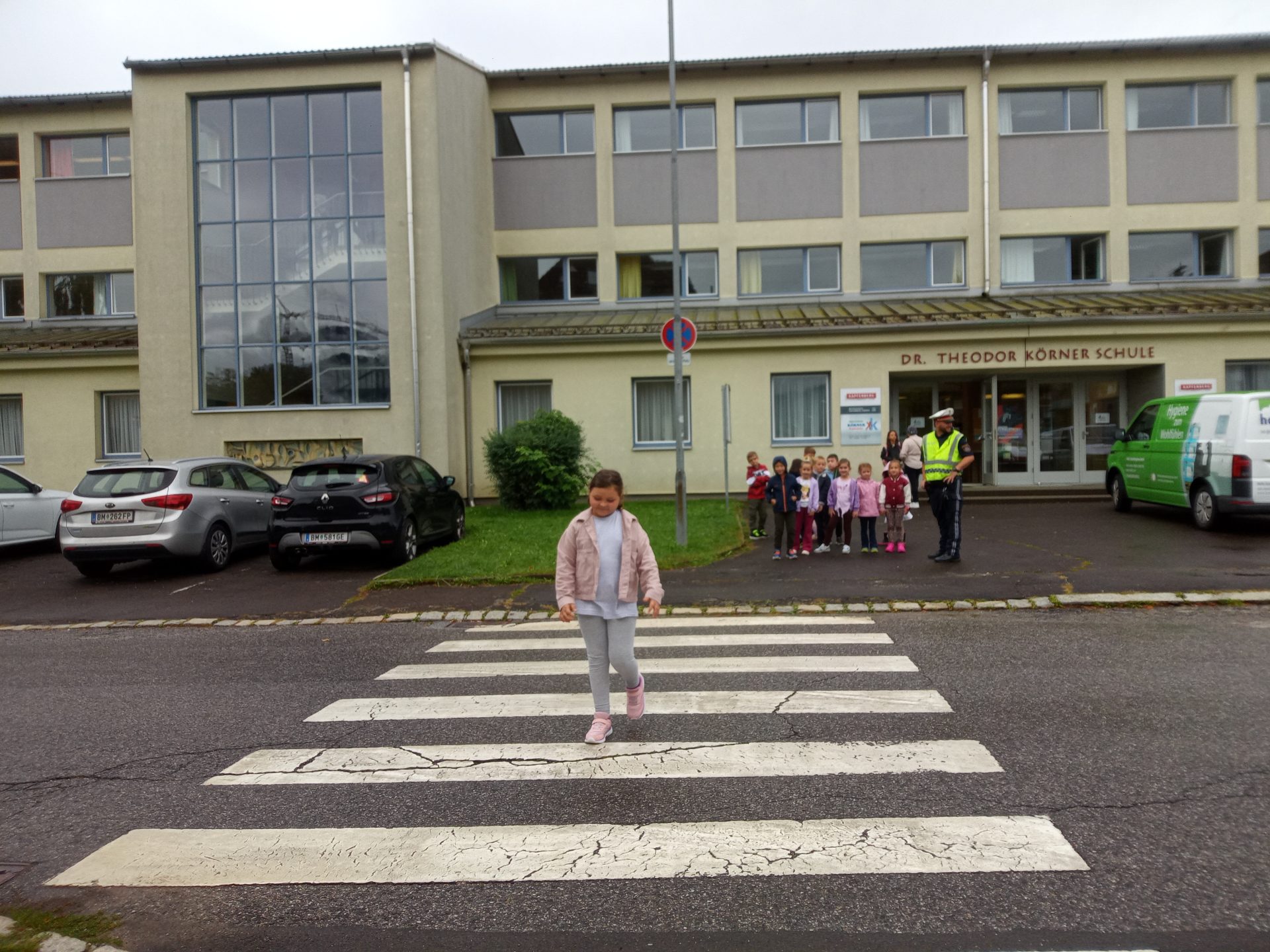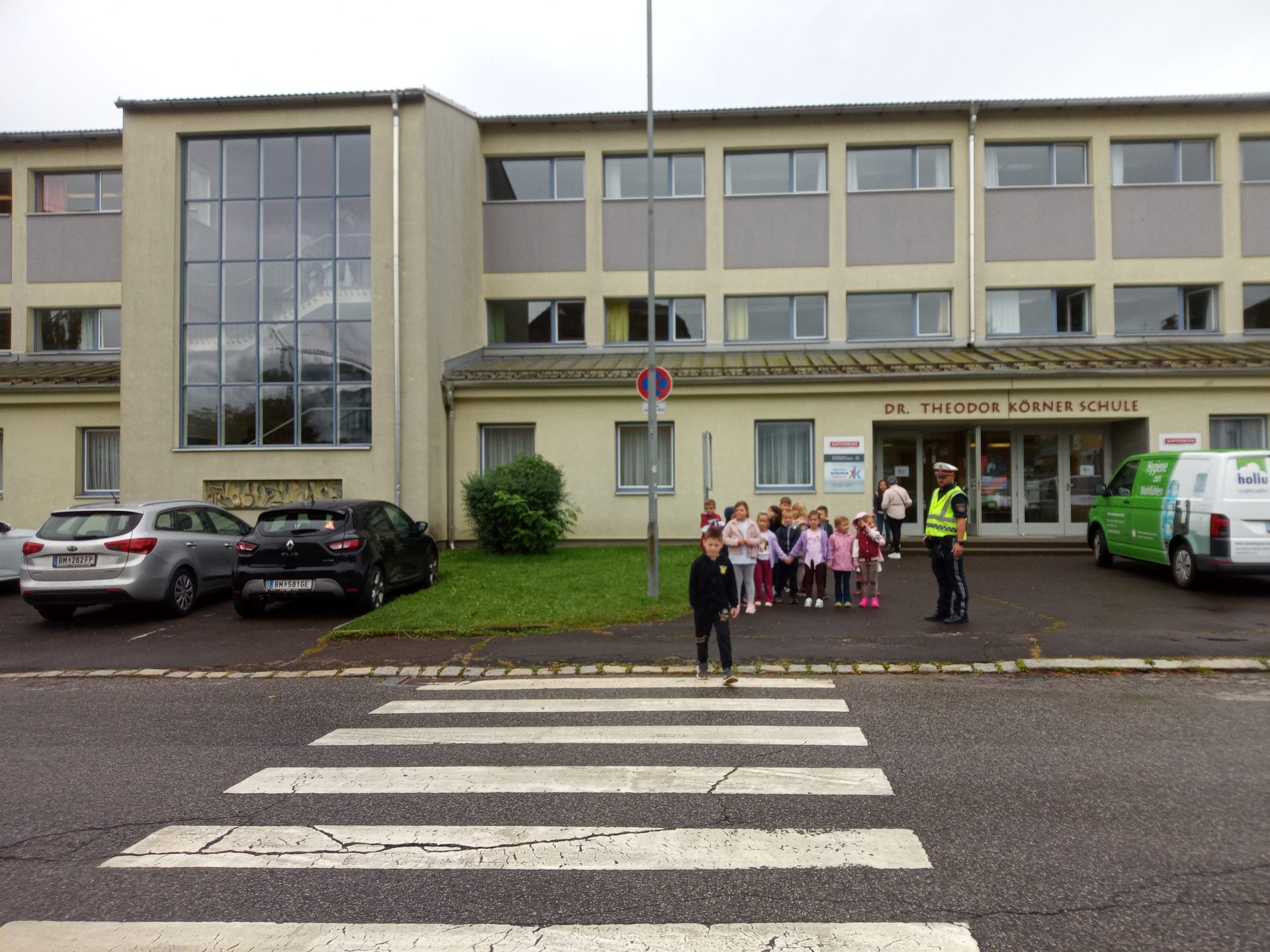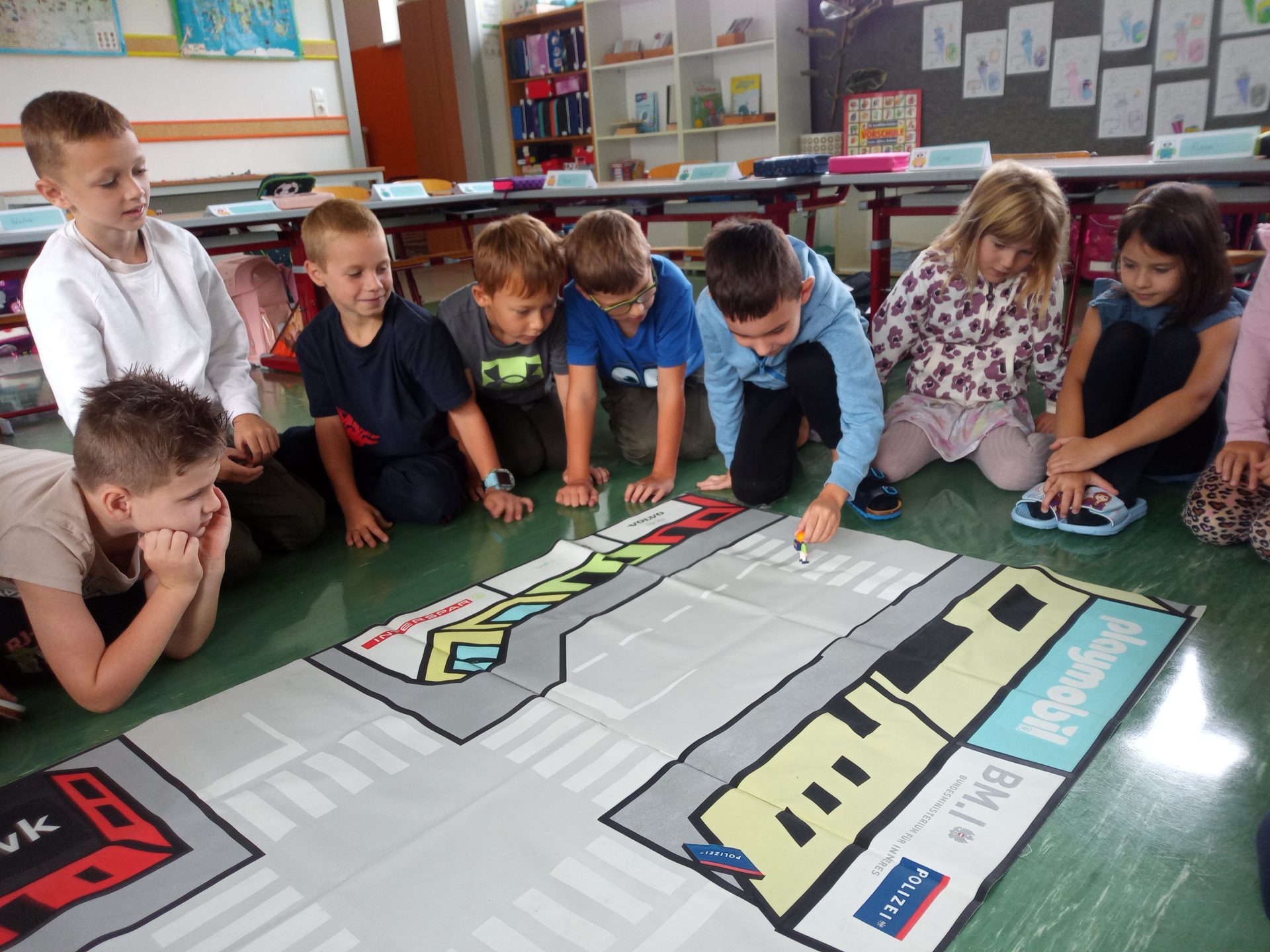 Für mehr Sicherheit am täglichen Schulweg bekamen die ersten Klassen Besuch von der Polizei. Nachdem mit einem Verkehrsteppich die wichtigen Themen zum Verhalten im Straßenverkehr erarbeitet wurden, übten die Kinder das richtige Überqueren der Straße auch auf dem Zebrastreifen vor der Schule.