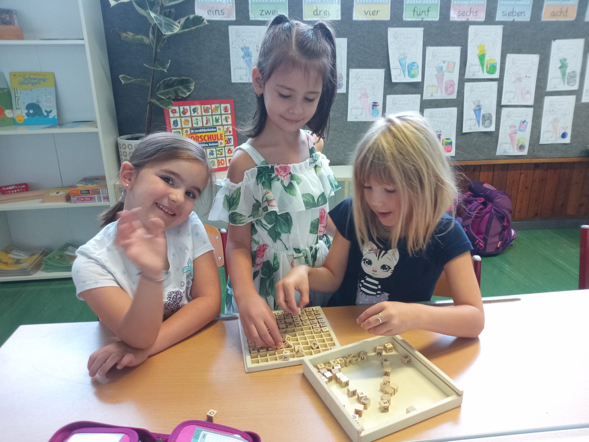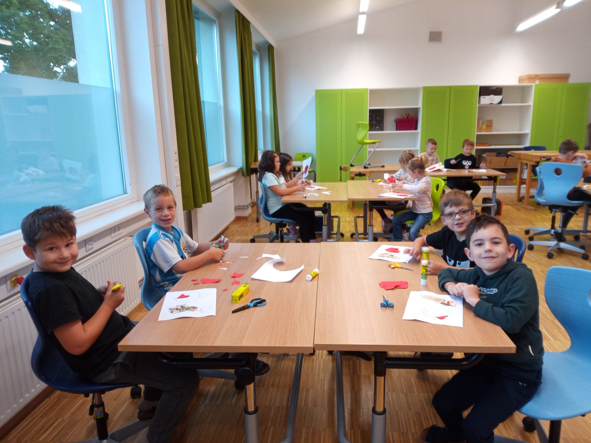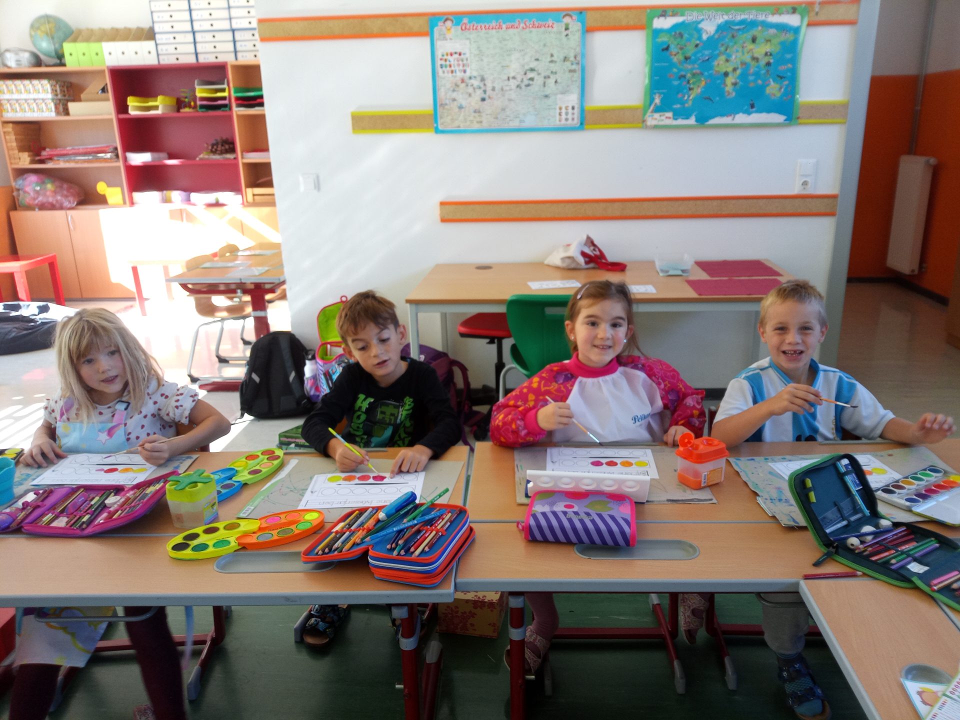 Nach den aufregenden ersten Schultagen haben sich die Kinder der ersten Klasse schon gut in der Volksschule eingelebt. Gemeinsam spielen sie nicht nur in der Pause, sondern lernen auch während der Stunde jeden Tag spielend Neues. Die Kinder setzen sich mit Wörtern und Zahlen auseinander, bewegen sich gerne im Turnsaal, erstellen die ersten Werkstücke im Werkraum oder zeichnen in der Klasse.
