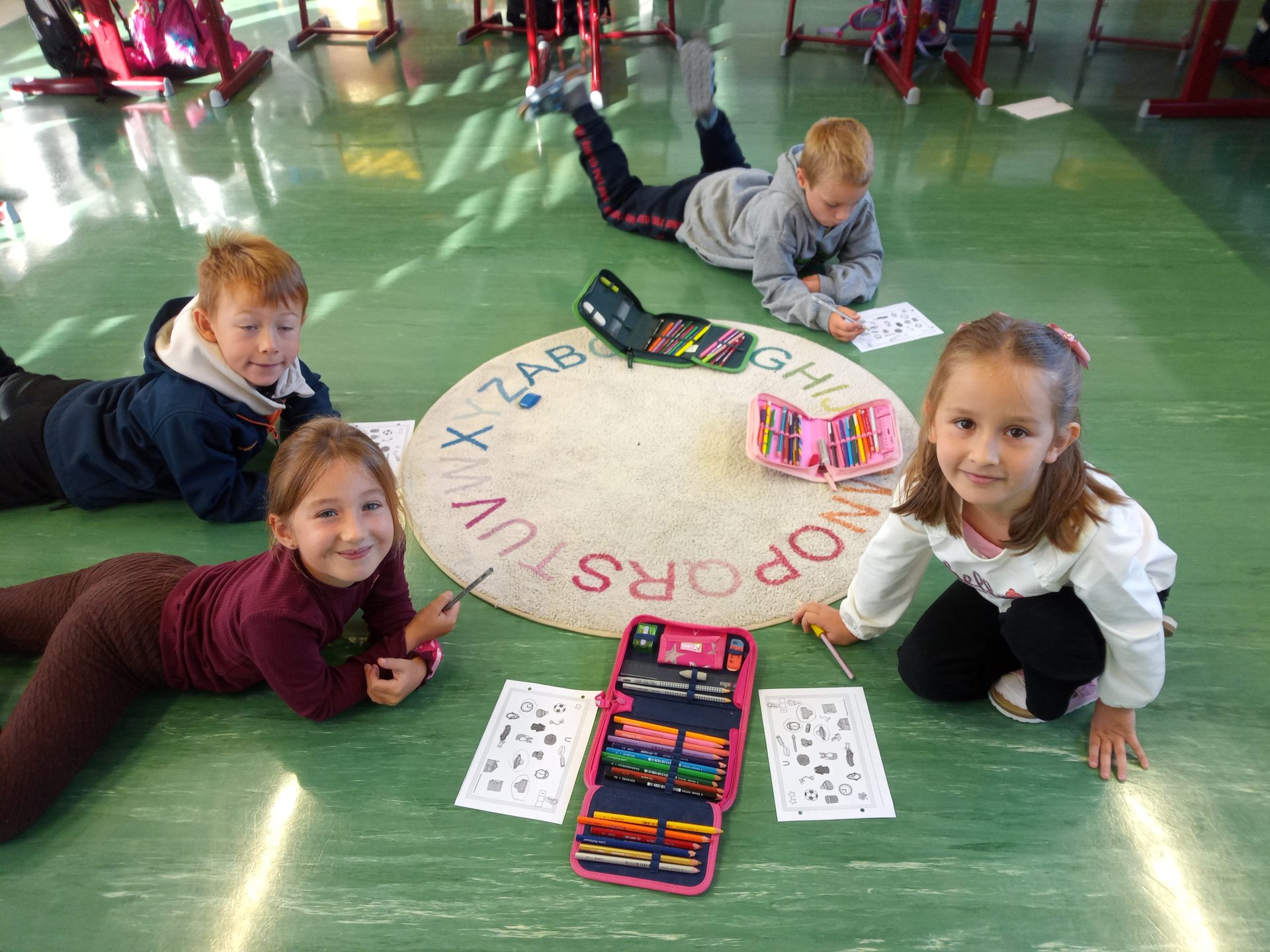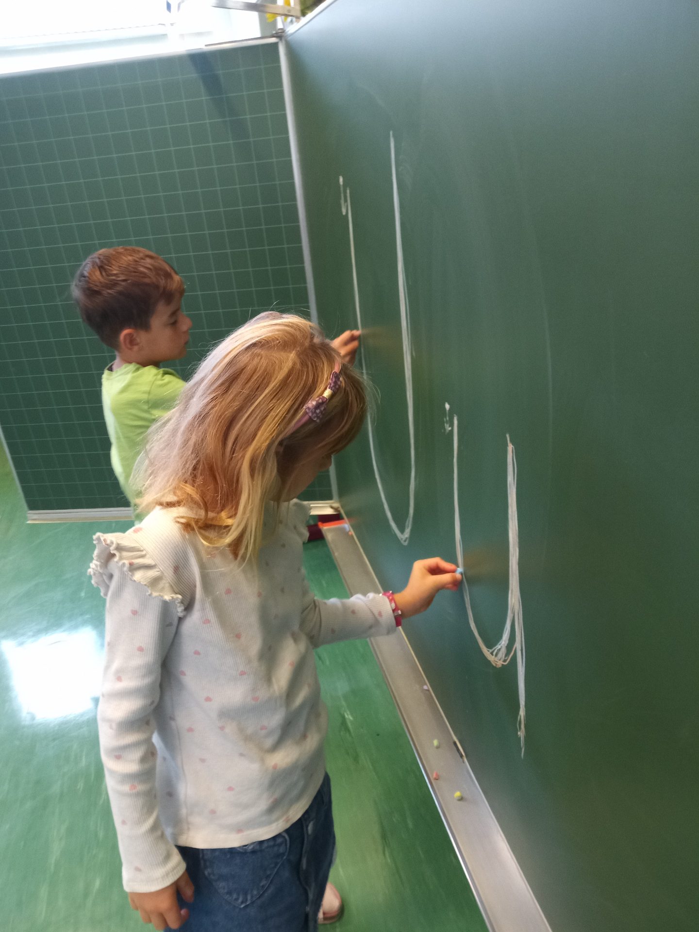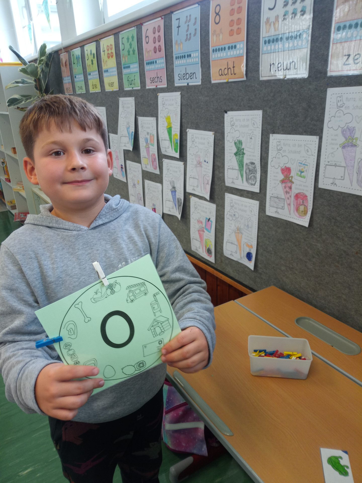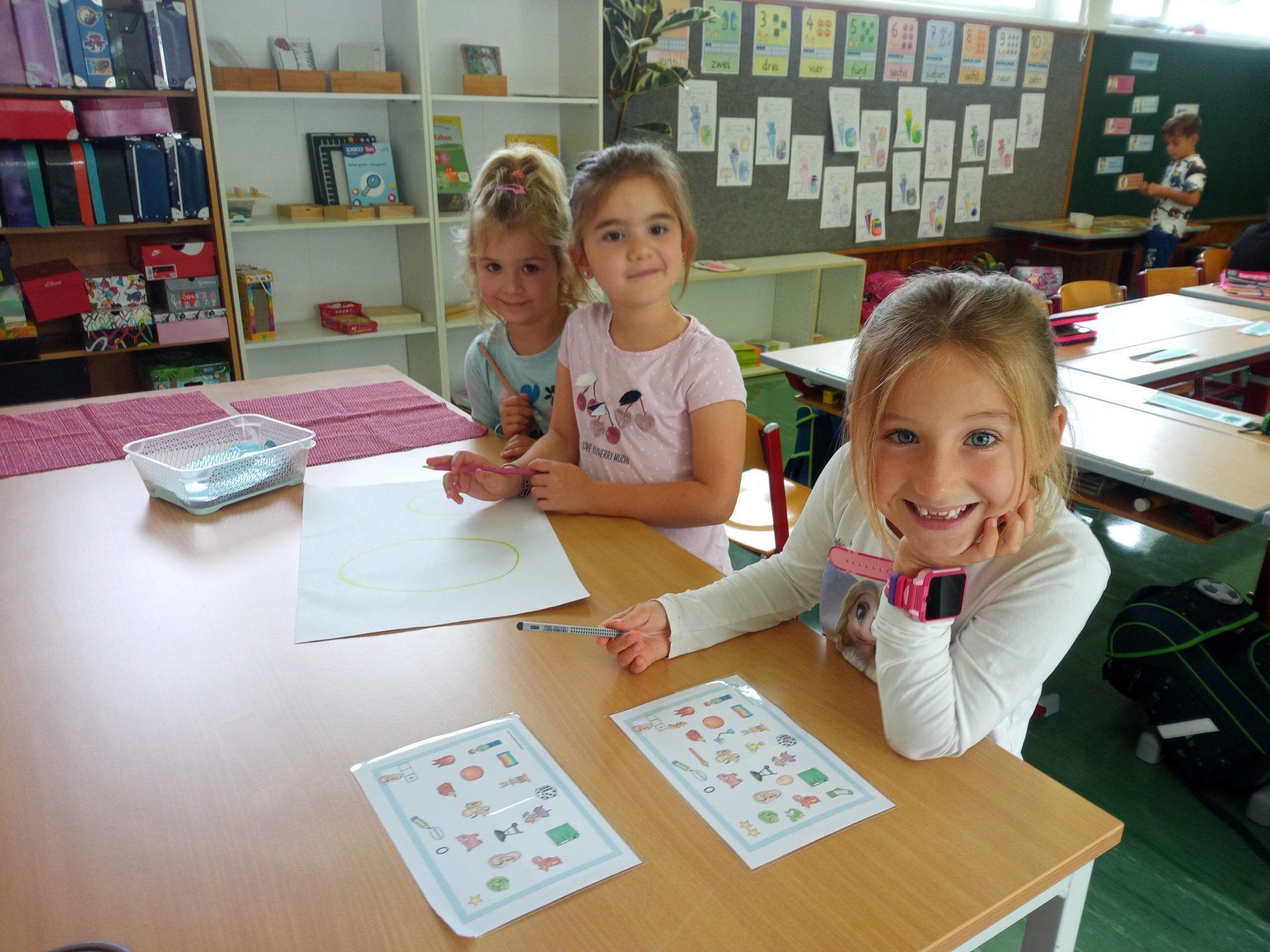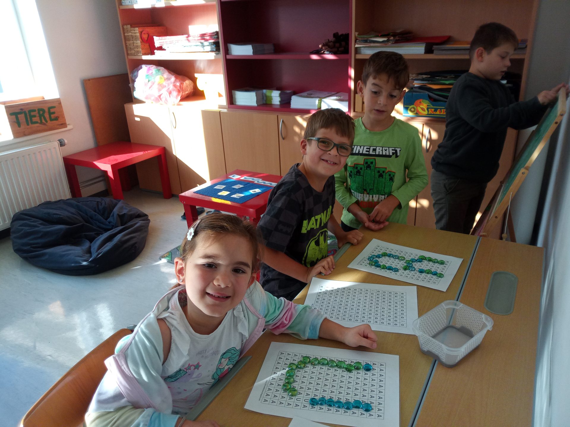 Jede Woche lernen die Kinde der ersten Klasse einen neuen Buchstaben, dabei wird die Schreibrichtung an der Tafel geübt, der Buchstabe mit unterschiedlichen Materialien gelegt, die Grafomotorik geschult, es werden Laute identifiziert, der Buchstabe unter vielen weiteren Buchstaben gefunden, viele Wörter werden in Silben eingeteilt, Puzzles vervollständigt und vieles mehr. Die Aufgaben bei den Stationen am Buchstabentag machen allen Kindern viel Spaß!