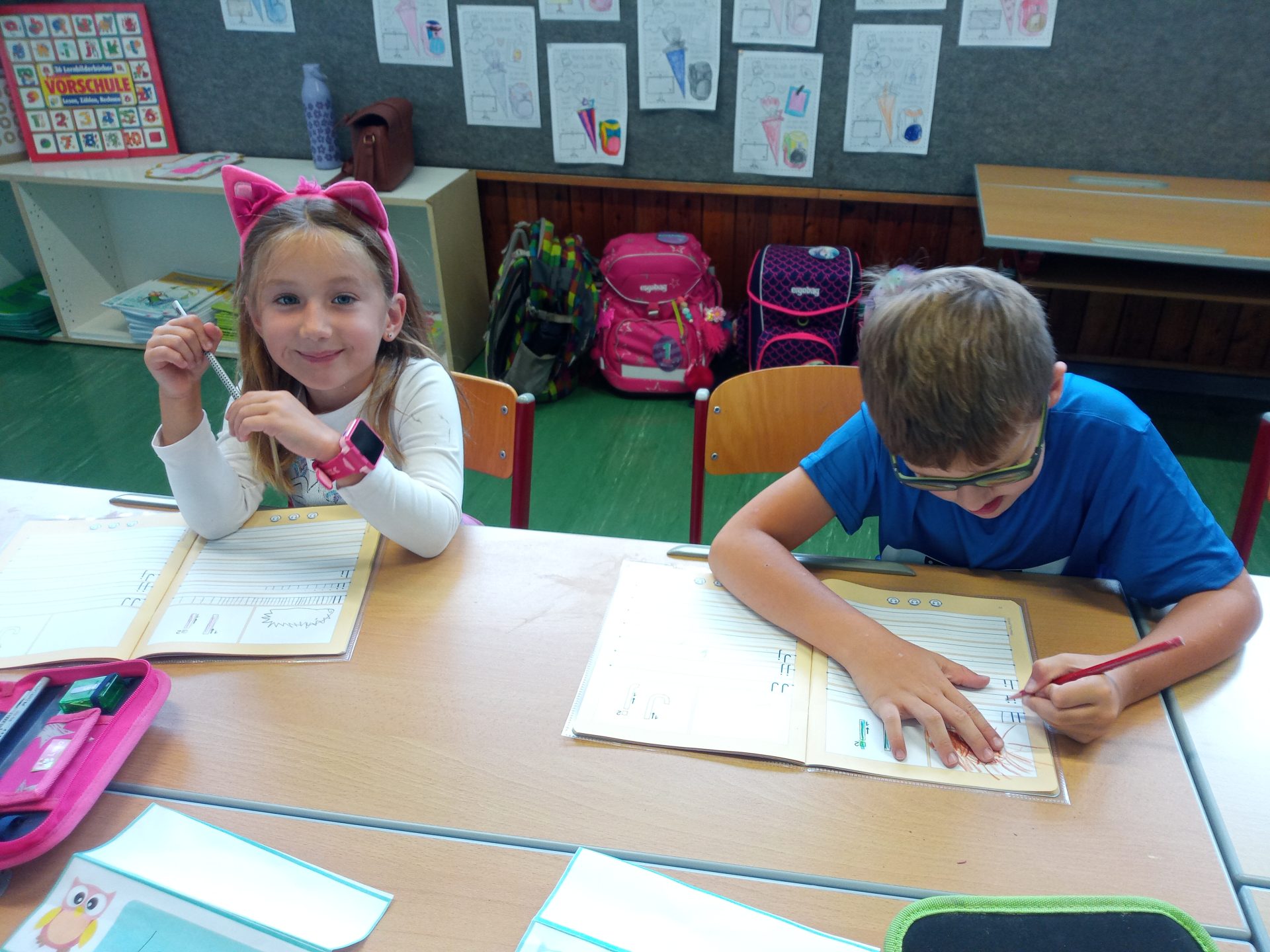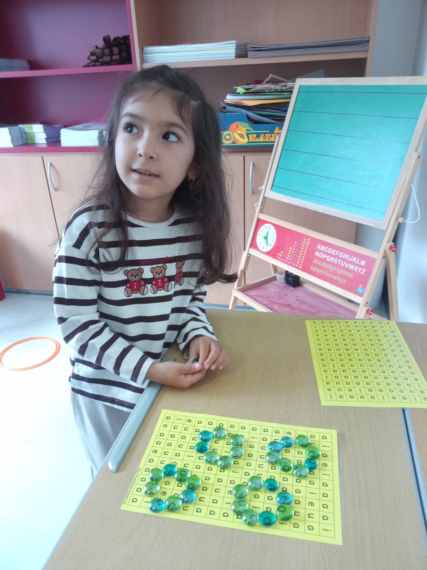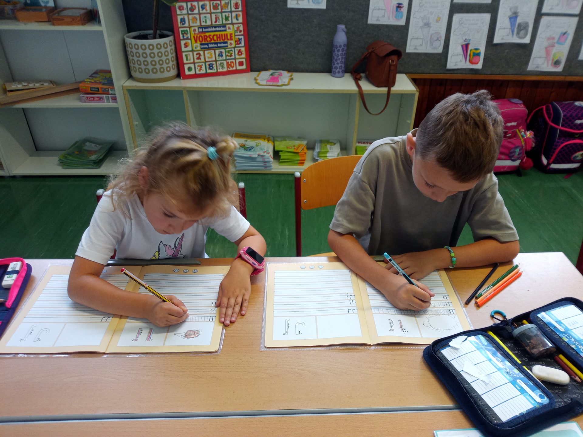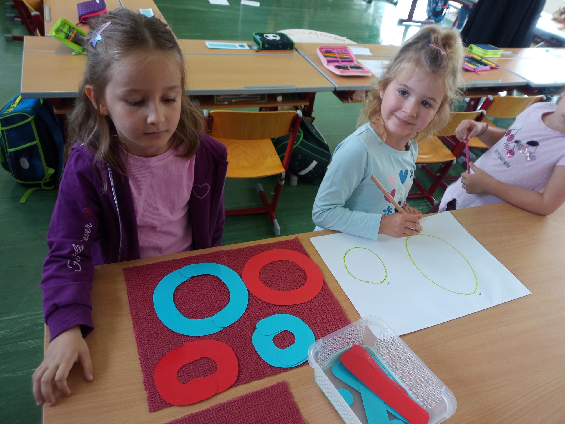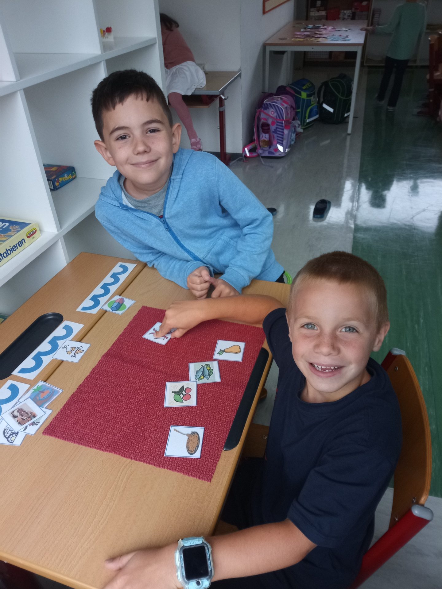 Jede Woche lernen die Kinde der ersten Klasse einen neuen Buchstaben, dabei wird die Schreibrichtung an der Tafel geübt, der Buchstabe mit unterschiedlichen Materialien gelegt, die Grafomotorik geschult, es werden Laute identifiziert, der Buchstabe unter vielen weiteren Buchstaben gefunden, viele Wörter werden in Silben eingeteilt, Puzzles vervollständigt und vieles mehr. Die Aufgaben bei den Stationen am Buchstabentag machen allen Kindern viel Spaß!