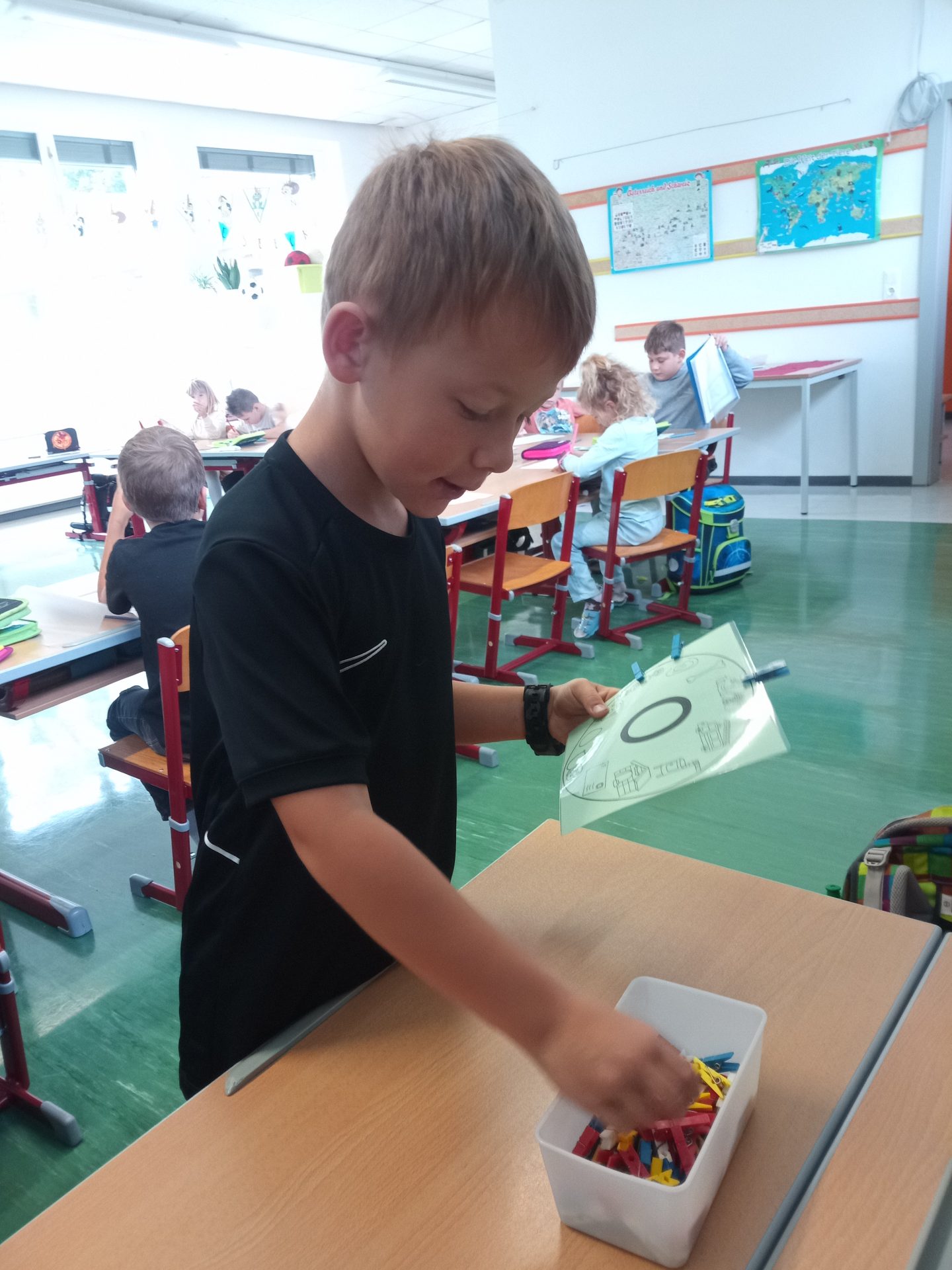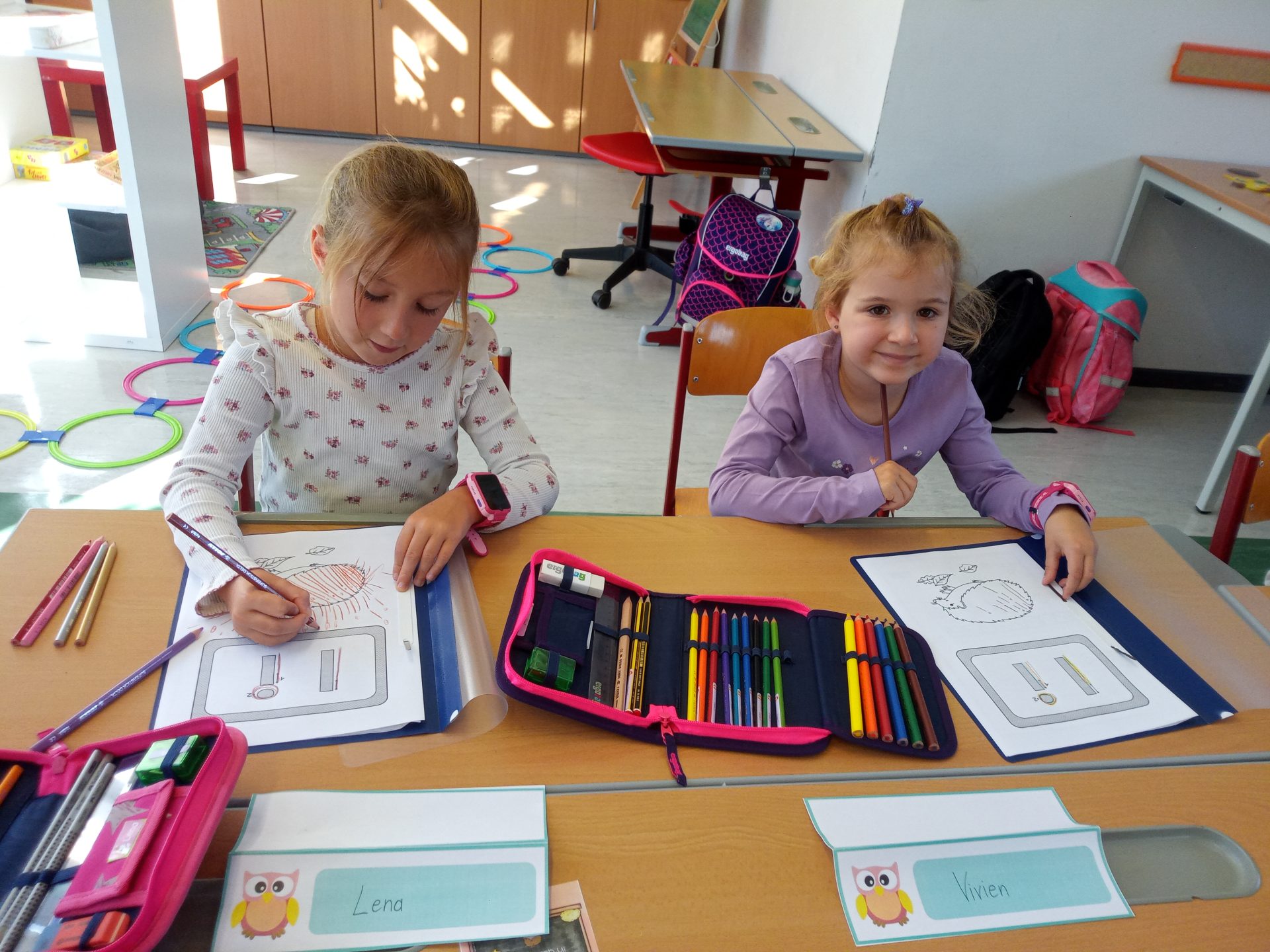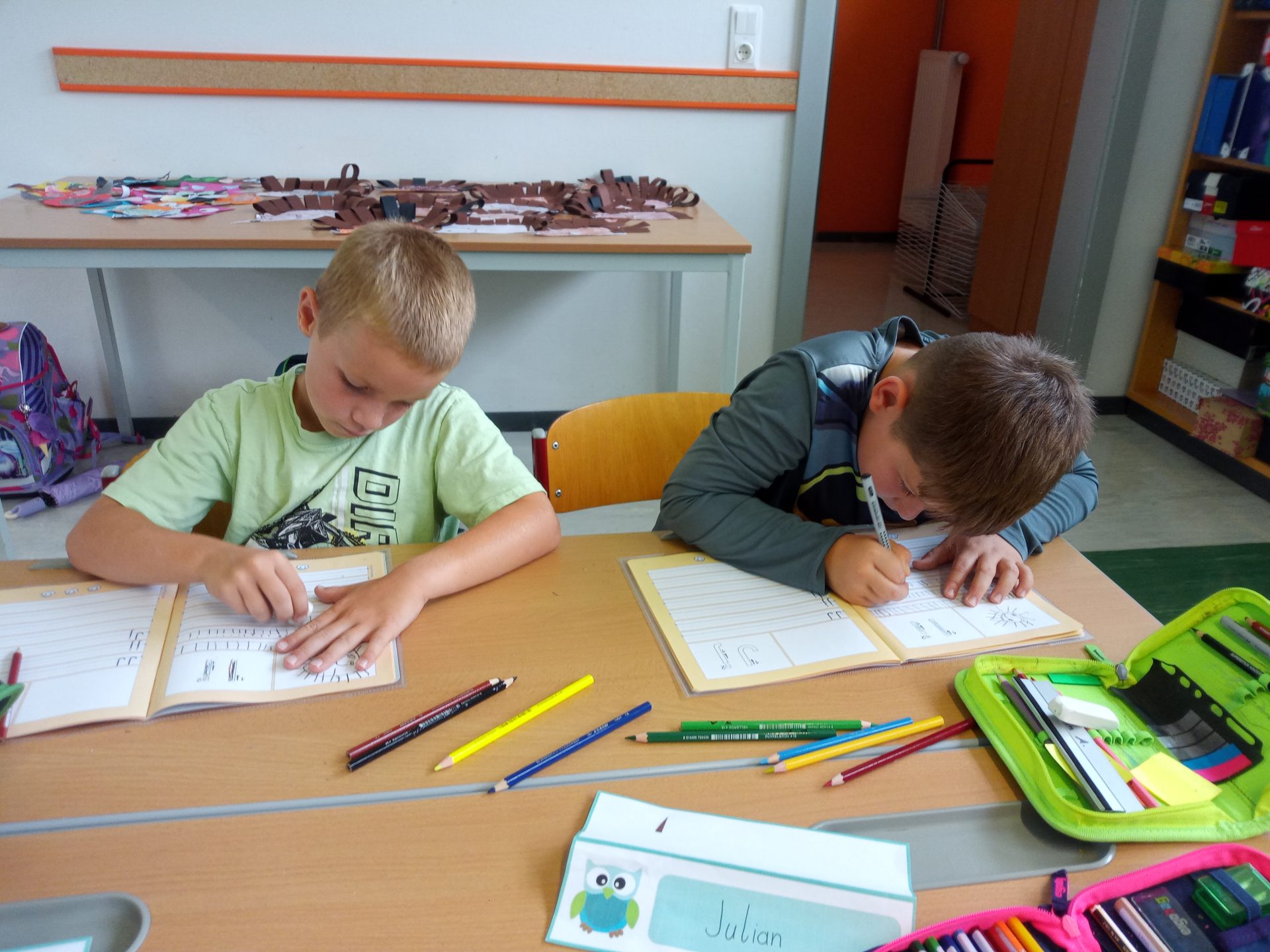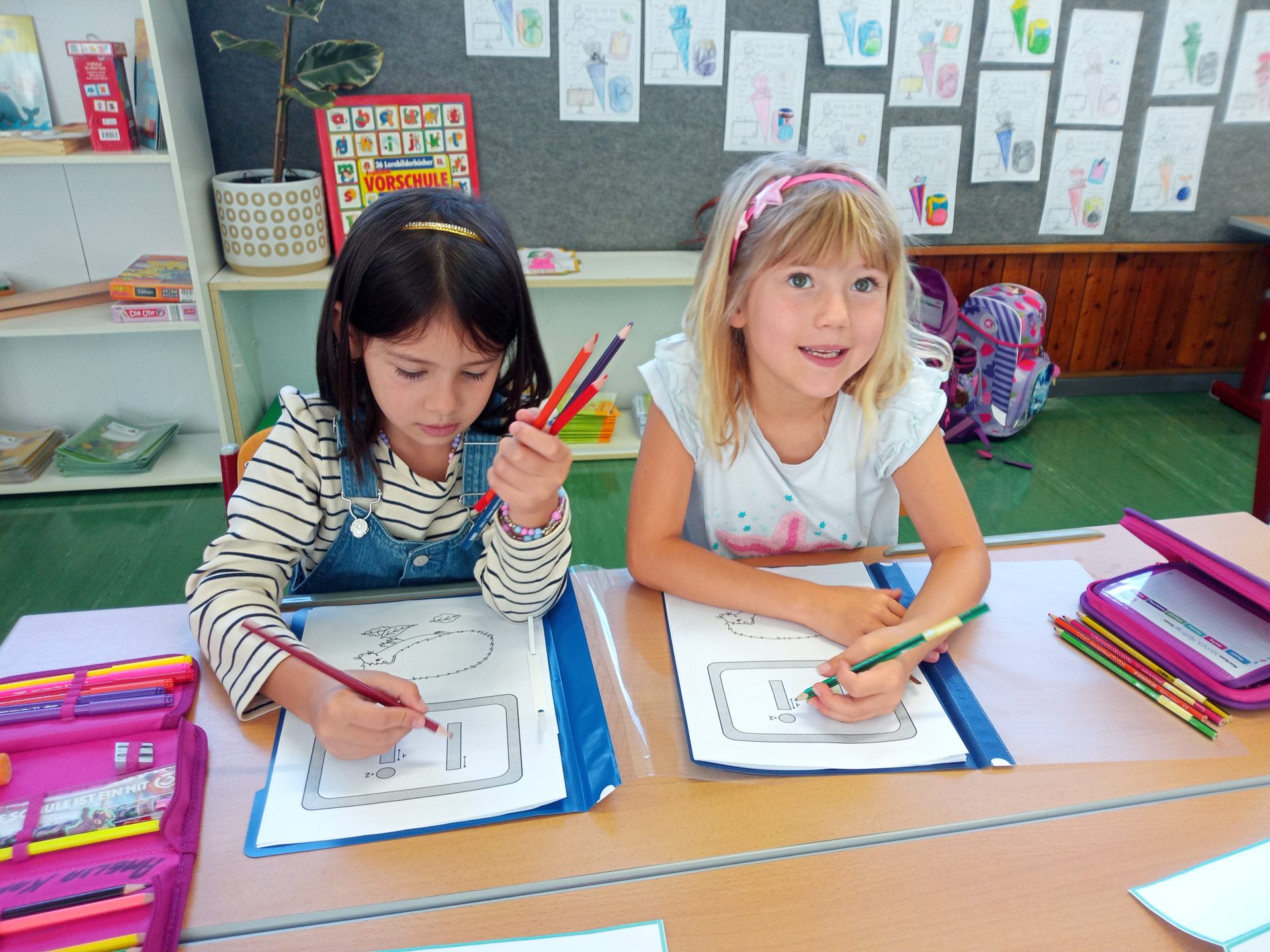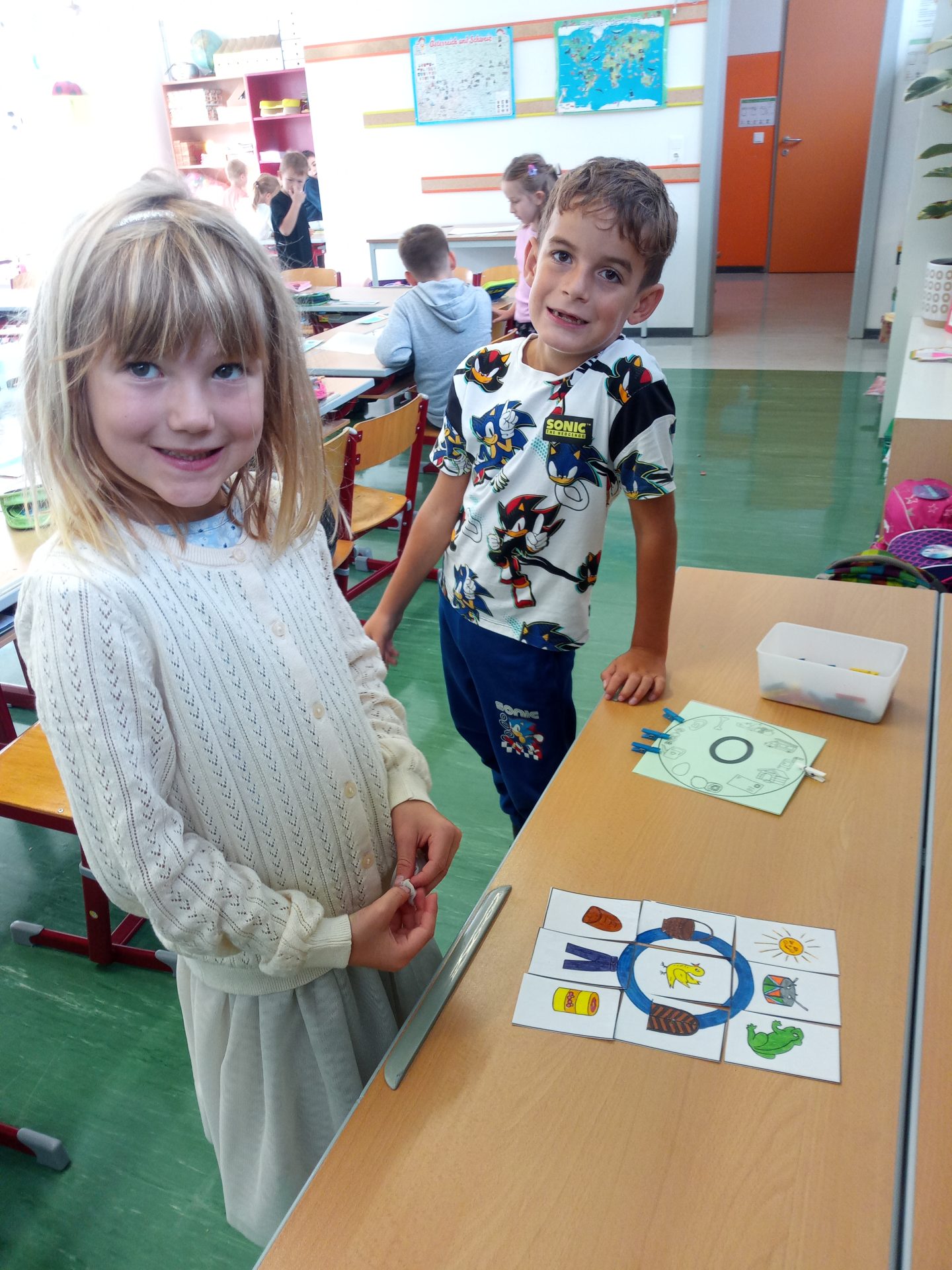 Jede Woche lernen die Kinde der ersten Klasse einen neuen Buchstaben, dabei wird die Schreibrichtung an der Tafel geübt, der Buchstabe mit unterschiedlichen Materialien gelegt, die Grafomotorik geschult, es werden Laute identifiziert, der Buchstabe unter vielen weiteren Buchstaben gefunden, viele Wörter werden in Silben eingeteilt, Puzzles vervollständigt und vieles mehr. Die Aufgaben bei den Stationen am Buchstabentag machen allen Kindern viel Spaß!