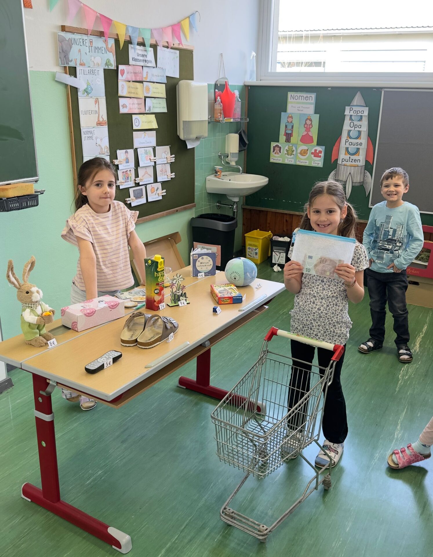Die Kinder durften abwechselnd in die Rolle der Verkäufer:innen sowie der Kund:innen schlüpfen. Dabei wurde gerechnet, bezahlt, herausgegeben und auch genau überlegt, ob das Geld für alle Wünsche ausreicht.