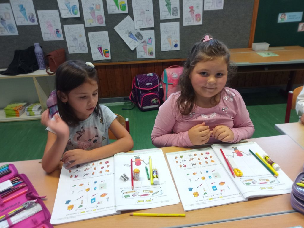 Nach den aufregenden ersten Schultagen haben sich die Kinder der ersten Klasse schon gut in der Volksschule eingelebt. Gemeinsam spielen sie nicht nur in der Pause, sondern lernen auch während der Stunde jeden Tag spielend Neues. Die Kinder setzen sich mit Wörtern und Zahlen auseinander, bewegen sich gerne im Turnsaal, erstellen die ersten Werkstücke im Werkraum oder zeichnen in der Klasse.
