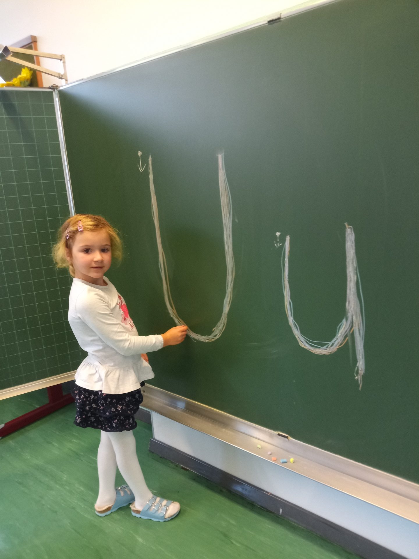 Jede Woche lernen die Kinde der ersten Klasse einen neuen Buchstaben, dabei wird die Schreibrichtung an der Tafel geübt, der Buchstabe mit unterschiedlichen Materialien gelegt, die Grafomotorik geschult, es werden Laute identifiziert, der Buchstabe unter vielen weiteren Buchstaben gefunden, viele Wörter werden in Silben eingeteilt, Puzzles vervollständigt und vieles mehr. Die Aufgaben bei den Stationen am Buchstabentag machen allen Kindern viel Spaß!